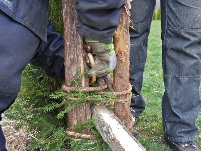 Stakarna sätts så att de lutar lite utåt och bildar ett V för att det ska bli stabilare när man sedan binder ihop dem.