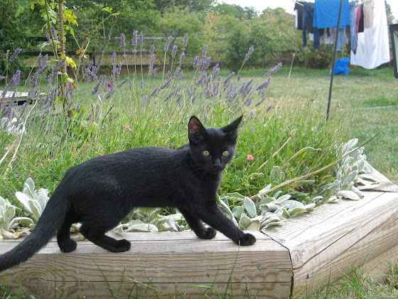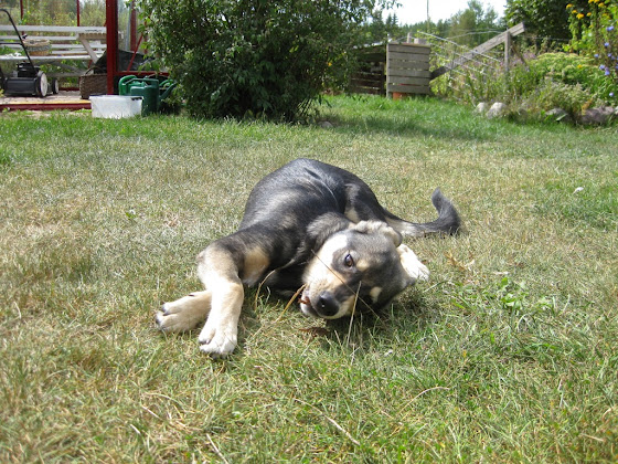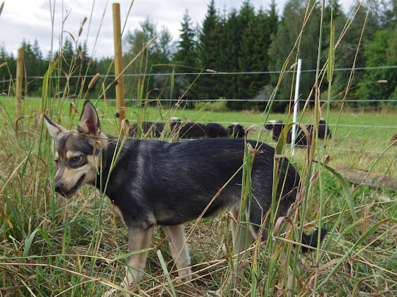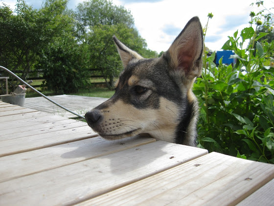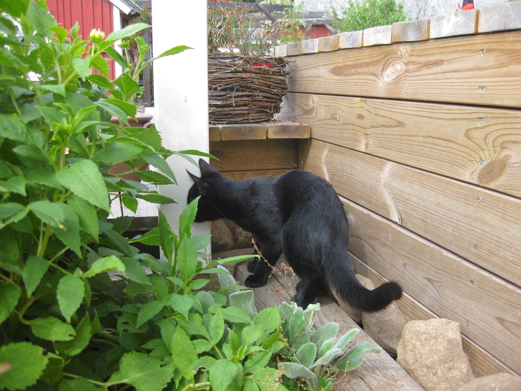 Inte helt oväntat så är Bosse den som är modigast och har nu rekat området fram till brygghuset och rabatterna närmast huset.