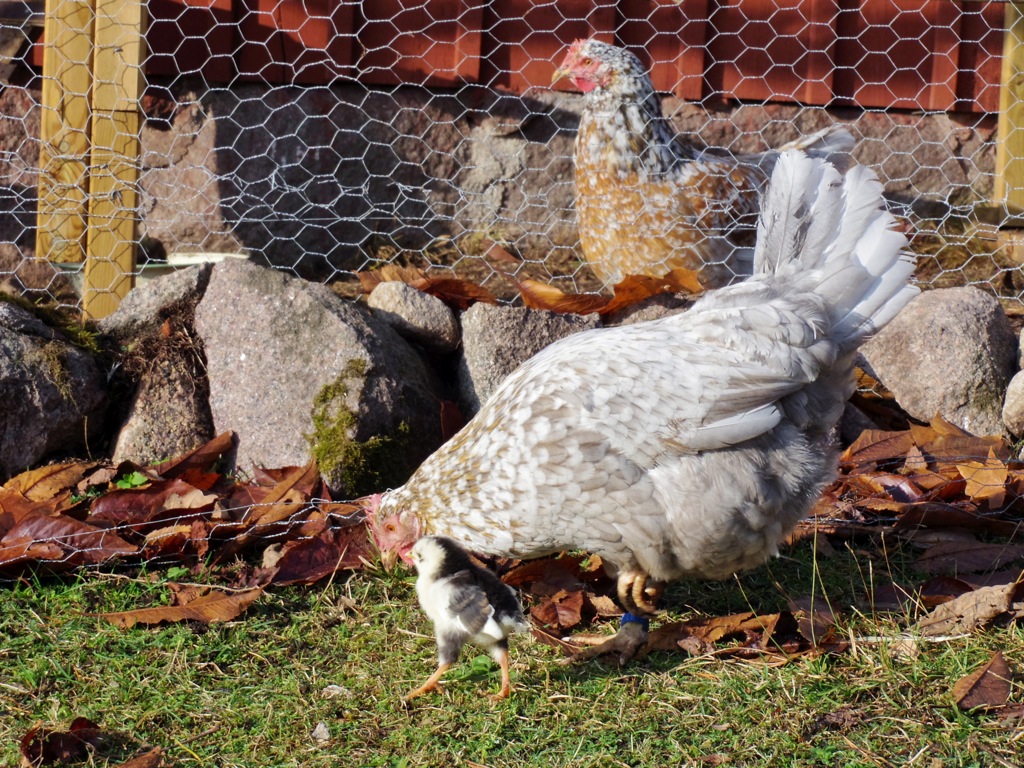 Hönan Selma har börjat ta med sin kyckling ut i den stora världen och den springer pipande efter henne vart än hon går.
