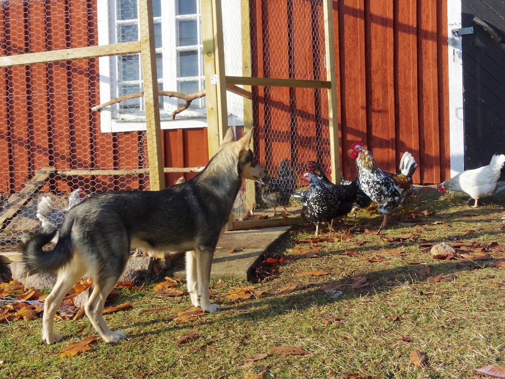 Valpen har börjat kunna vara lös utan att jaga hönsen som går runt och söker mat.
