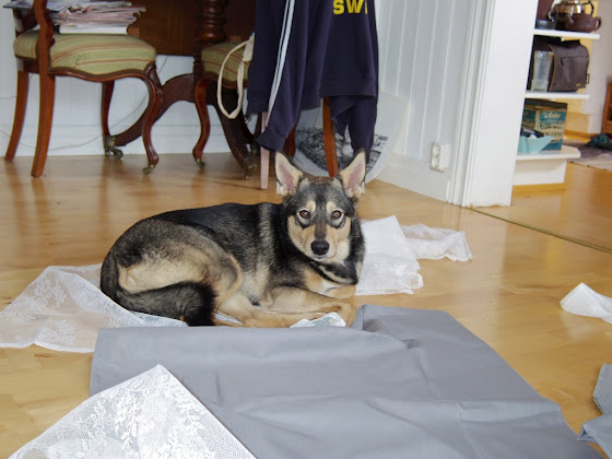 Eftersom kylan också krypit in i huset så har jag ägnat de senast dagarna åt att sy draperier och gardiner. I den utbyggda köksdelen har vi inte haft några gardiner alls så får man bara upp något så borde det ju isolera lite. I den egentliga huvudhallen (som nu är klädförvaringsrum) så drar det också in en del och där har jag nu satt upp ett draperi som förhoppningsvis håller lite av kylan på plats. Det är inte helt lätt att sy när man har en hund och två nyfikna katter. Den ena tycker allt tyg som lagts på golvet är hennes sovplats, de andra anser att allt som är på golvet (eller på bordet, eller på stolen) är deras leksaker.