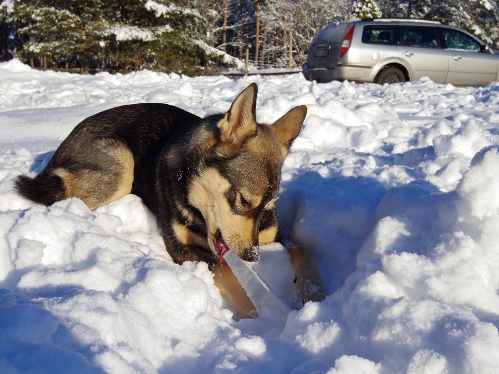 Sen när man bor på landet så är det ju inte ”bara” att skotta från ytterdörr till bil/gata och eventuellt garageporten. Här skottar vi gångar från hus till brygghus, från hus till grind, vidare till bilar vidare till stall och lada och sen en avstickare till vedboden. Sen ska man tillbaka en liten bit och skotta upp biten till fårhagen och sen vidare till hönshuset. När man sen kommer tillbaka till grinden så måste gårdsplanen skottas om man vill ha en möjlighet att komma ut med bilarna till vägen. Sist men inte minst så ska det skottas upp en liten väg till källaren och sen bort till grisarna. SEN är man klar. Bara gångarna tar ca 30 min, gårdsplan lika lång tid. Förutom igår, då vår vänlige granne kom över och körde bort all snö med sin traktor! Astá tyckte traktorn med det blinkande ljuset och märkliga ljuden var väldigt läskig men snöbergen den lämnade efter sig var fantastiska. Isen från djurens vattenbaljor är också fantastiskt god enligt Astá!
