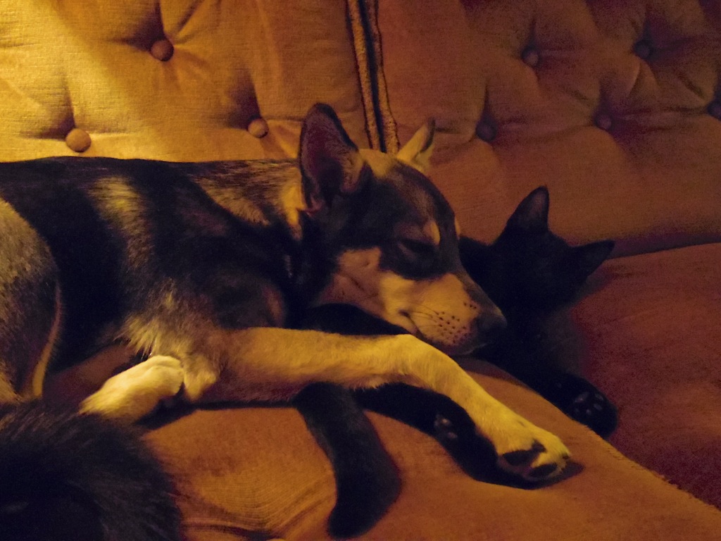 Med katterna och henne så går det jättebra nu, och vad är en kompis om inte en som accepterar att vara huvudkudde när man sover? 😉