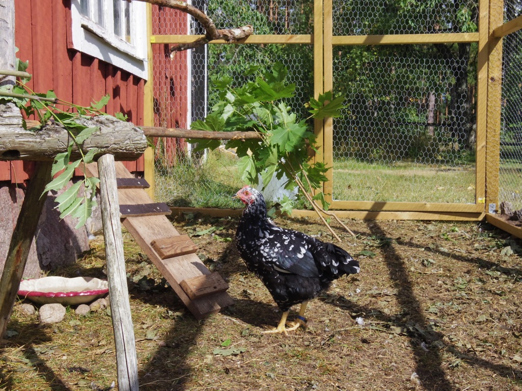 Jag vill snart börja släppa ut hönsen också men först vill jag sätta upp ett hönsnät mot vägen ifall de skulle få för sig att knata iväg åt det hållet. Under tiden så sysselsätter jag mig med att berika deras miljö i hönsgården! Jag har skruvat upp lite grova grenar, ställt in lite gamla sågbockar som fanns här på gården och skruvat upp en skiva så de har ett litet gömställe under den och en liten plattform att stå på. Så brukar jag varje dag klippa lite sly och sätta in åt dem, både så grönskan ger lite skugga och så att de har något grönt att äta! Vi har också byggt upp en liten stenmur för att hålla nere hönsnätet samt för att göra det lite mer dekorativt!